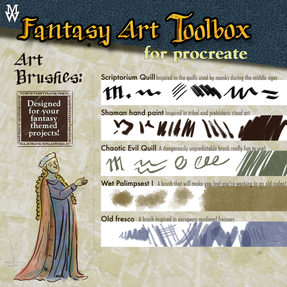 – 26 Art Brushes, Inspired in Pencils, Medieval Quills, Romanic Fresco Brushes, etc. Designed for your Fantasy themed illustrations.
