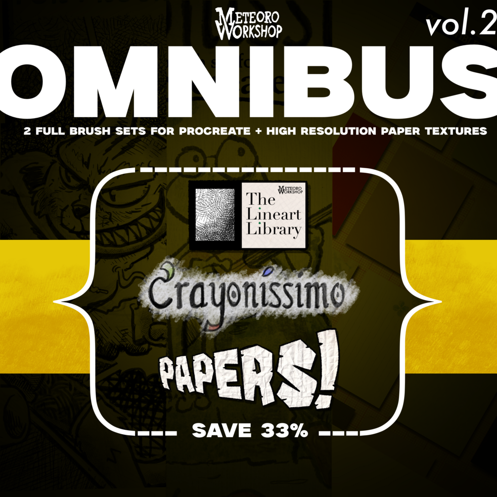 Save 33% Omnibus vol2: Inking, crosshatching, Crayons, Color pencils & Paper textures for Procreate